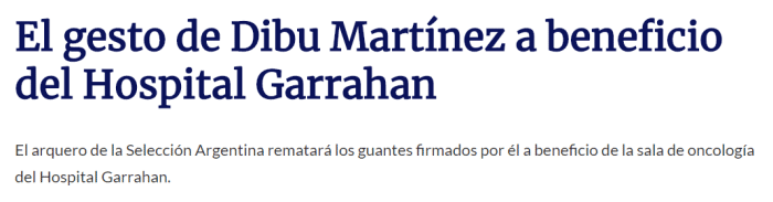大马丁专门为此录了一段视频,视频中他表示自己将拍卖一幅他在世界杯期间使用过的一副手套,并将所得全部捐给Garrahan医院。