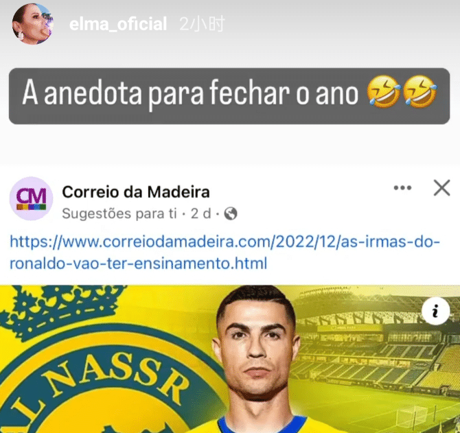 如今看起来C罗确实无限接近加盟到利雅得胜利,但就在这个时间点,C罗的大姐Elma在社交媒体上转发相关的新闻,疑似回复签约传闻,称:“年终笑话一则。”
