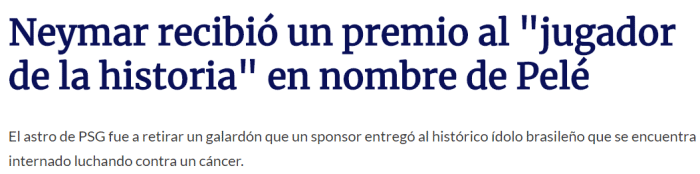 该媒体表示,“历史最佳球员”奖项由世界杯赞助商百威啤酒评选出,最终巴西球王贝利成功当选。但目前贝利已经病危,其身体状况不允许他亲自前往领奖,因此巴西球星内马尔将代替贝利前往领奖。