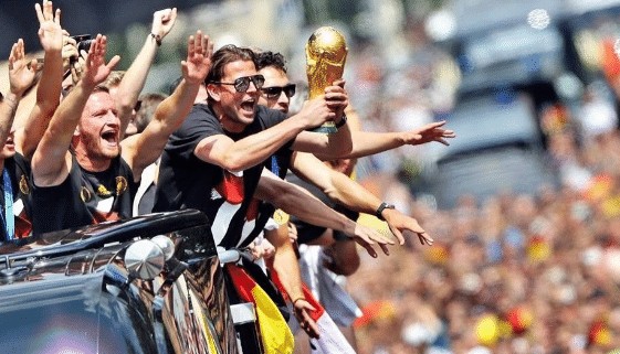 德国队在2014年夺得世界杯冠军,球迷们齐聚德国首都柏林勃兰登堡门前与他们的英雄欢庆胜利。德国队举办夺冠庆典,现场有将近50万球迷,游行的过程秩序也组织的很好,同时庆典活动有主持人在进行流程,球员们出场的方式各有不同,非常欢喜。