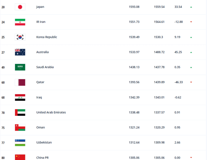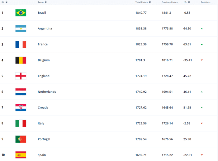 JRS直播网12月22日讯 ,国际足联官方公布2022年国家队最终排名,巴西队依然排在榜首,新科世界杯冠军阿根廷排在第2,中国队排名下降一位,位居第80名。