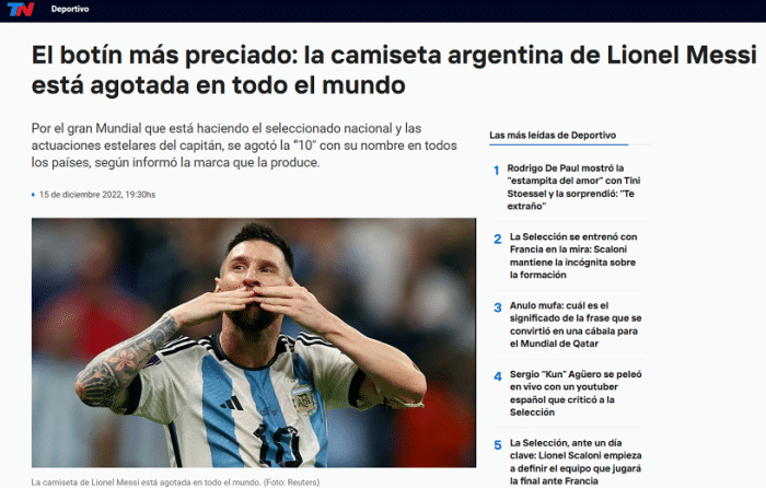 阿根廷的球迷们确实很疯狂,除了世界杯举办地有大量的球迷之外,梅西的战袍也售罄,这是根据《TN》的消息显示:梅西的阿根廷球衣在全球范围内已经全部售罄,到现在为止,世界上没有一家阿迪商店还有梅西阿根廷队10号球衣的库存。 赞助商针对这样的局面,给出的回应也很有深意:“面对目前的情况,不会增加产量满足需求。”