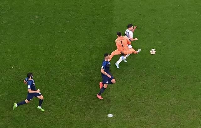 从回放来看,当时阿尔瓦雷斯接到队友传球形成单刀球。克罗地亚门将利瓦科维奇出击,但阿尔瓦雷斯抢先完成射门,不过被克罗地亚人解围。但同时,出击的利瓦科维奇,也放倒了阿尔瓦雷斯。最终,裁判吹罚利瓦科维奇犯规,阿根廷获得点球。
