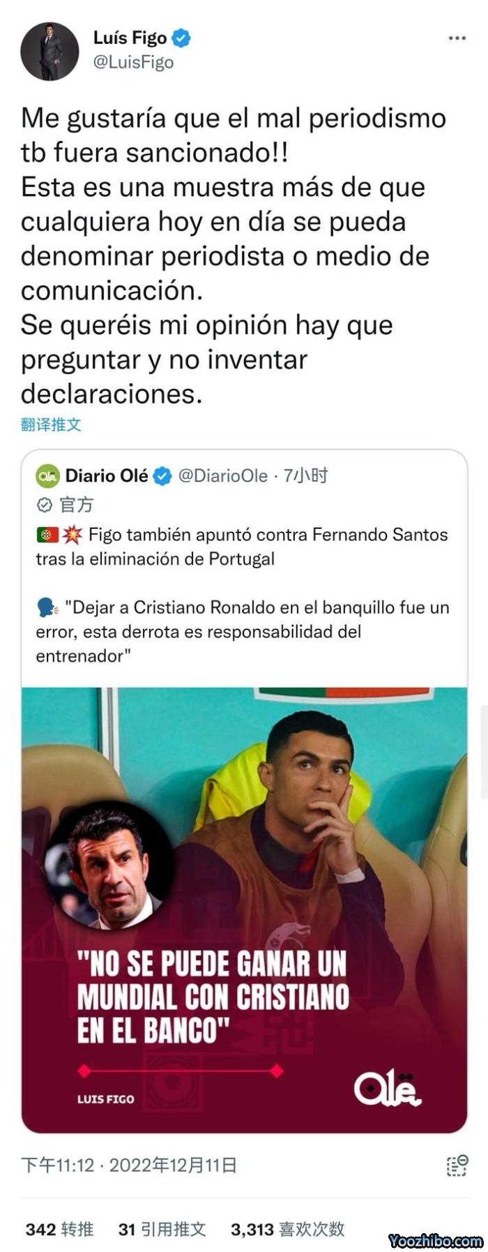 JRS直播网12月13日阿根廷媒体《奥莱报》发文表示:菲戈在葡萄牙被淘汰后也盯上了费尔南多-桑托斯,“让克里斯蒂亚诺-罗纳尔多坐在替补席上是个错误,这场失利是主教练的责任。”