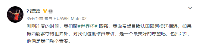 冯潇霆写到:刚刚连麦的时候,我们聊世界杯四强,我说希望目睹法国跟阿根廷相遇,如果梅西能够夺得世界杯,对我们这批球员来讲,是一个最美好的愿望吧。包括C罗,他俩是我们整个青春。