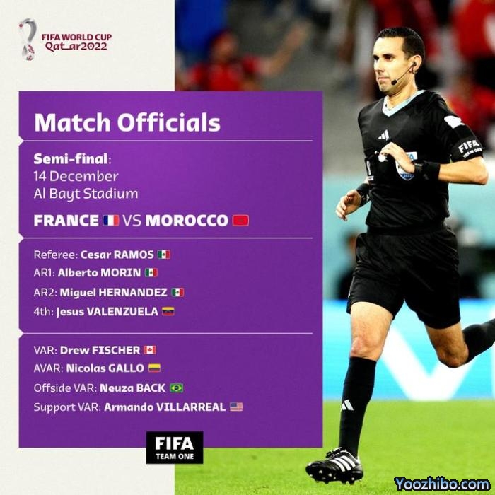 JRS直播网讯 北京时间12月15日凌晨3点,法国将在世界杯半决赛迎战摩洛哥,今天FIFA公布了裁判团队,墨西哥籍裁判塞萨尔-拉莫斯将执法本场比赛。