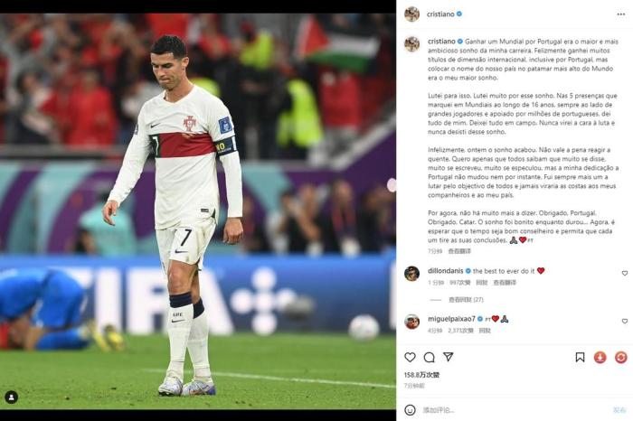 JRS直播网12月12日昨天深夜,C罗在Instagram发长文告别世界杯,他表示为葡萄牙赢得世界杯的最大梦想已经结束了。
