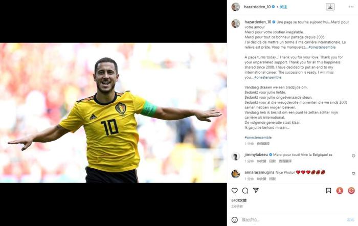 阿扎尔:一个段落翻篇了,感谢所有人的爱,感谢你们无与伦比的支持,感谢所有自2008年以来与我分享的所有快乐;我决定结束自己的国家队生涯,年轻人已经准备就绪,我会想念你们的。