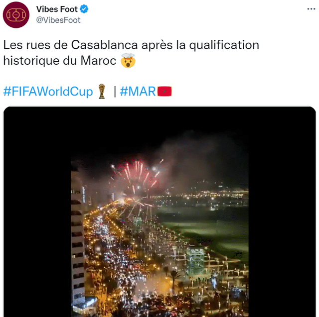 在本场比赛结束时,是北京时间凌晨2点左右,也就是摩洛哥拉巴特时间晚上7点。整个摩洛哥都陷入了疯狂。这个面积只有46万平方公里的小国,创造了奇迹。他们不但成为本届世界杯亚洲和非洲唯一进入8强的队伍,而且还成为史上第4支进入世界杯8强的非洲球队。