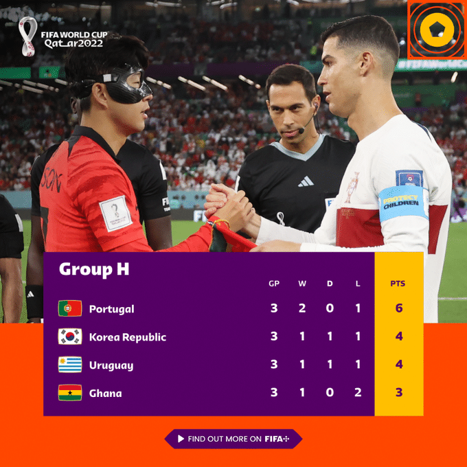 H组方面,韩国2-1击败葡萄牙,葡萄牙头名出线,韩国第二名出线,乌拉圭4分第三出局,加纳3分垫底出局。