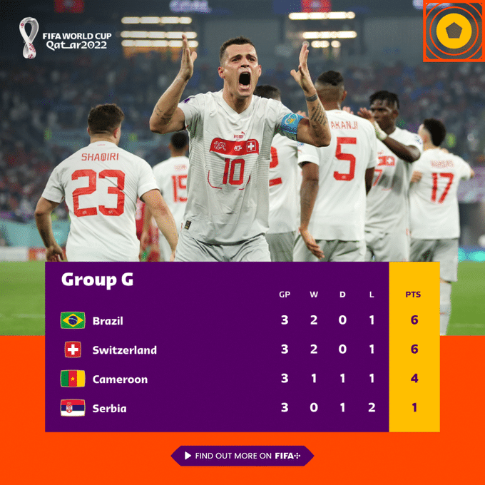 G组方面,巴西0-1不敌喀麦隆但仍然排名第一,头名出线,瑞士则3-2击败塞尔维亚,与巴西同积6分,小组第二出线,喀麦隆和塞尔维亚三四名淘汰。