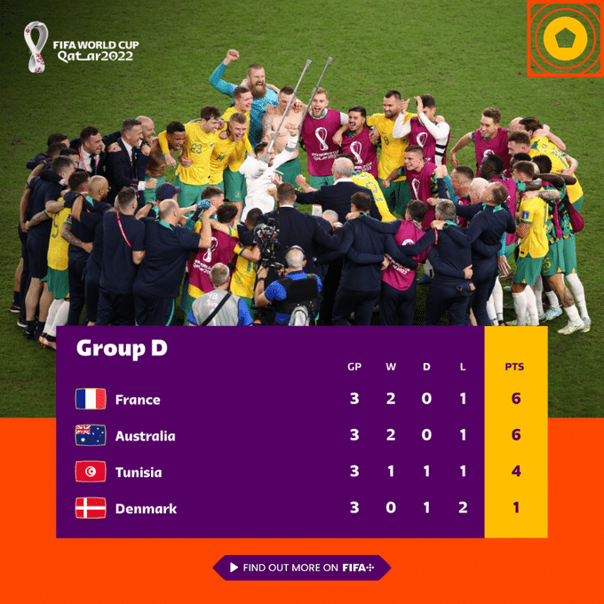 D组法国派出二队阵容0-1爆冷不敌突尼斯,澳大利亚1-0小胜丹麦,法国与澳大利亚同积6分,法国头名出线,澳大利亚小组第二出线。