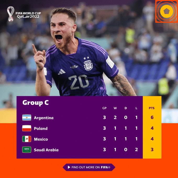 C组方面,阿根廷2-0击败波兰后6分排名小组第一,波兰虽然输球但因为净胜球优势排名第二出线,墨西哥击败2-1击败沙特,两队双双淘汰。