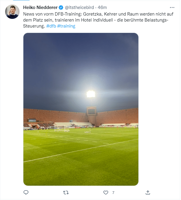 他在个人社媒上表示:德国球员格雷茨卡、科雷尔以及劳姆没有参加合练。他们在酒店里进行着单独负重训练。