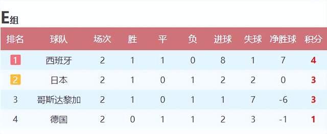 而世界排名第31位的哥斯达黎加,虽然有-6个净胜球,但末轮即便守成一场平局,也依然有机会晋级,那就是西班牙击败日本。而西班牙击败日本,就现在来看是大概率事件。小组赛4支球队末轮全部都要死磕,这也无愧是本届世界杯的死亡之组