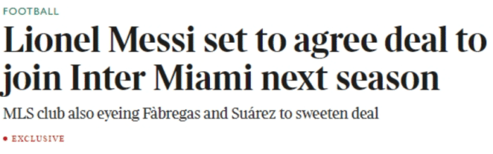 《泰晤士报》称,迈阿密国际老板贝克汉姆将让梅西成为大联盟历史上收入最高的球员,后者已同意明夏自由转会加盟。