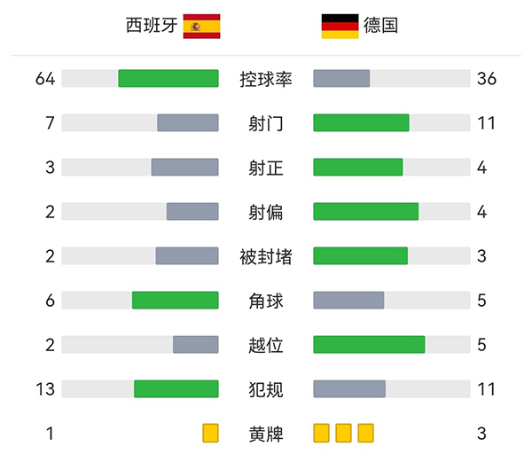 西班牙首发:23-乌奈-西蒙、20-卡瓦哈尔、16-罗德里-埃尔南德斯、24-拉波尔特、18-阿尔巴(81'14-阿莱士-巴尔德)、5-布斯克茨、9-加维(65'12-尼科-威廉斯)、26-佩德里、11-费兰-托雷斯(53'7-莫拉塔)、10-阿森西奥(65'8-科克)、21-奥尔莫