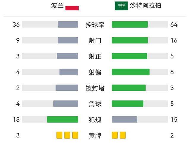 下半场伤停补时7分钟,全场比赛结束,最终波兰2-0击败沙特。