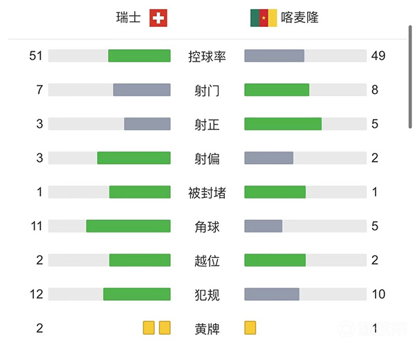 全场比赛结束,瑞士1-0击败喀麦隆。