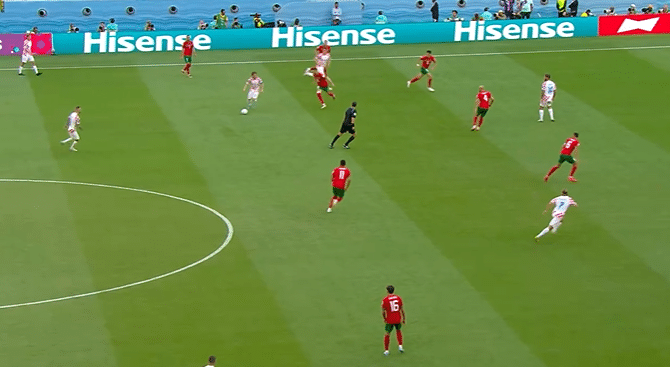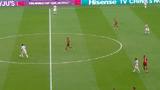 第14分钟,莫德里奇的外脚背挑传后点非常到位,可惜弗拉西奇包抄差一点点。莫德里奇的防守也很强硬,他撞翻了阿什拉夫。上半场结束前弗拉西奇的转身射门被防守球员封堵,但紧接着莫德里奇的远射,稍微高出了一点,非常遗憾。前45分钟,莫德里奇传球48次,44次成功,成功率92%,效率还是非常高的。