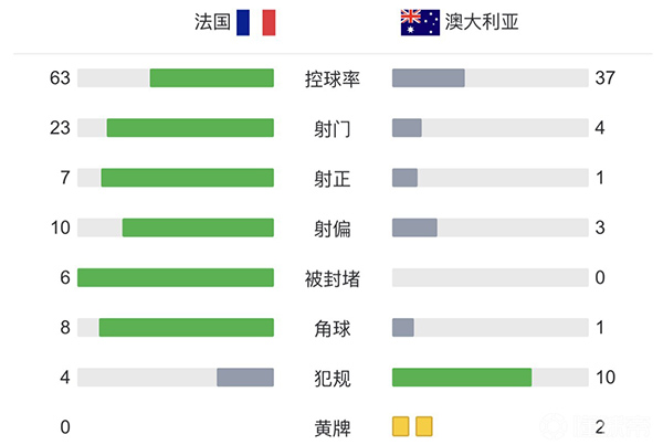 全场比赛结束,最终卫冕冠军法国4-1逆转澳大利亚取得开门红,D组积分榜方面,法国积3分位居榜首,澳大利亚积0分垫底。。