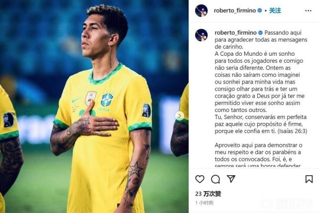 JRS直播网11月09日晚,落选巴西参加世界杯26人名单的菲尔米诺,在个人社交账号上首次发声。这位利物浦9号大气表示:“世界杯是每个球员的梦想,过去现在将来,我都将永远保卫祖国。”