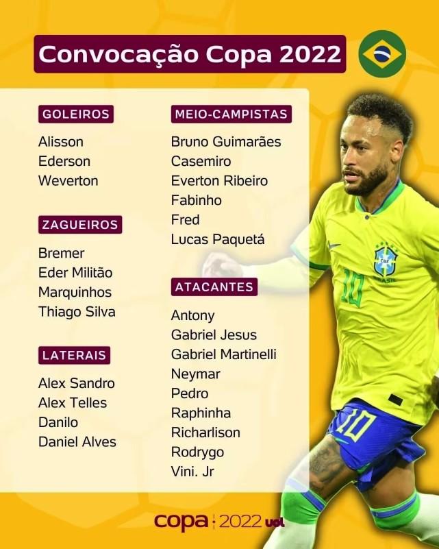 JRS直播网11月08日凌晨,巴西男足公布了2022年卡塔尔世界杯的26人参赛名单。内马尔、威尼休斯、热苏斯、卡塞米罗、马尔基尼奥、米利唐、蒂亚戈-席尔瓦、阿利松、埃德森等世界级球星,纷纷在列。