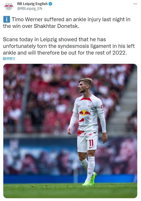JRS直播网11月04日讯 莱比锡红牛官方消息,维尔纳左脚踝韧带断裂,将无缘卡塔尔世界杯。