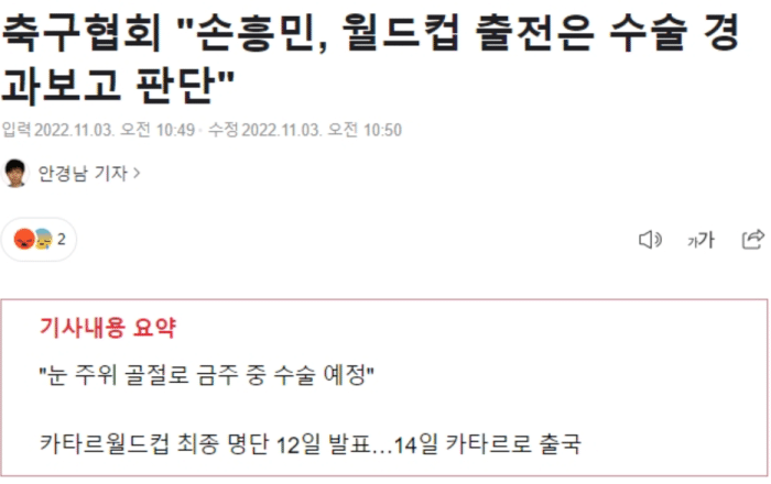JRS直播网11月03日讯 韩国足协官方消息,孙兴慜是否参加世界杯将在手术后评估。