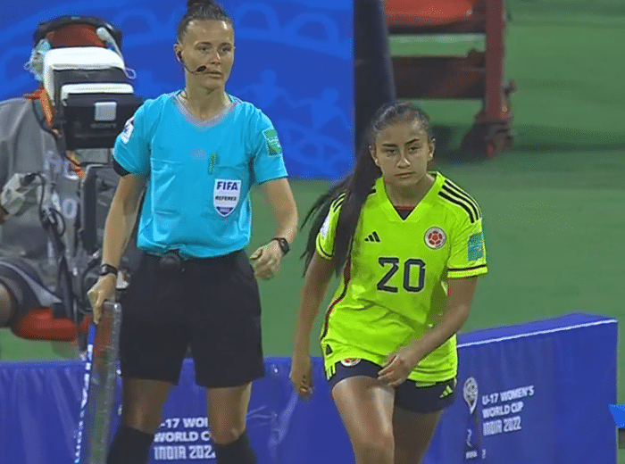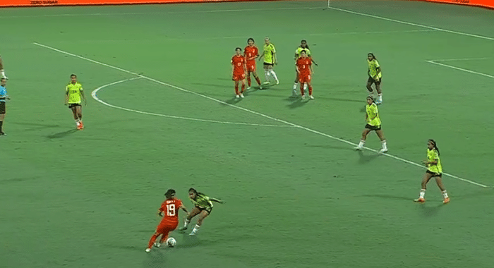 今天的比赛中国女足的首发阵容没有什么变化,延续了上一场的阵容,首发阵容:1-刘晨、2-许之译、3-王怡、4-黄嘉欣、10-乔睿琪、14-曾雨佳、6-卢家玉、7-霍悦欣、11-王粒橙、17-欧阳玉环、9-尹丽红。上半场的比赛第2分钟,中国队完成了本场比赛第一脚射门,霍悦欣一脚远射被对方门将没收,比赛来到第9分钟的时候,哥伦比亚率先打破场上僵局,中国女足后防线出现失误,琳达补射破门,中国女足0:1落后。
