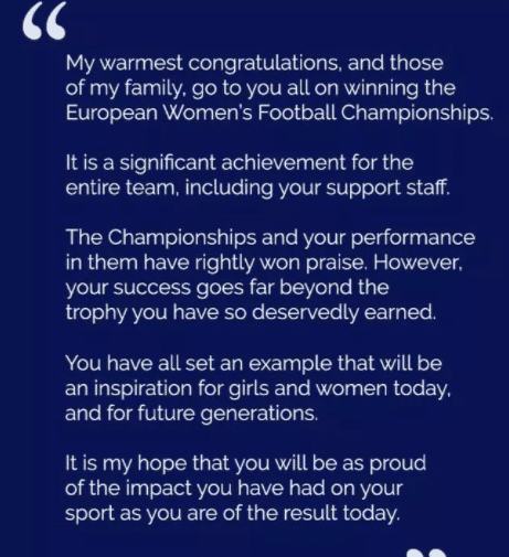 到了2022年,足球的荣耀来到英格兰女足,2022年女足欧洲杯决赛,英格兰女足以2-1击败德国女足,首夺女足欧洲杯冠军。已经96岁的伊丽莎白女王发文送上祝贺,称:“我与我的家人,祝贺你们赢得女足欧洲杯冠军,这是整个队伍以及全体人员的杰出成就。你们树立了榜样,鼓舞了现今的女孩与女人们,以及未来的一代代人。”