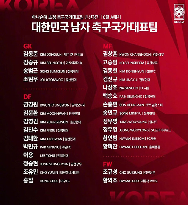 JRS直播网讯韩国国家队成立於1928年,有“太极虎”和“亚洲虎”之称的韩国是最多次成功晋身至世界杯决赛圈的亚洲球队,卡塔尔世界杯是韩国国家队第11次晋级世界杯决赛圈。在这里你可以了解球队的最新阵容名单以及历史战绩。