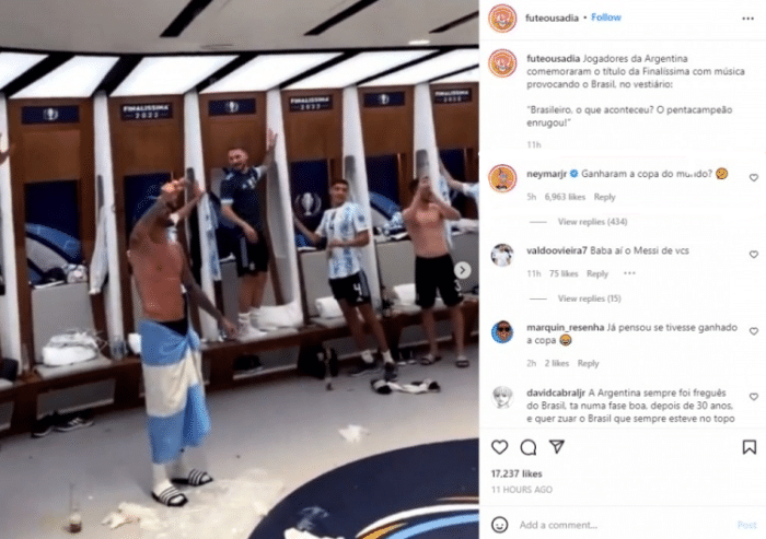 JRS直播网06月03日讯 昨天,阿根廷3-0大胜意大利夺得欧美杯冠军,赛后阿根廷全队在更衣室嘲讽巴西,对此内马尔作出了回应。