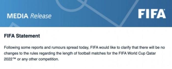 JRS直播网04月07日讯 国际足联今日发表声明,表示世界杯或其他任何赛事的比赛时长不会改变。
