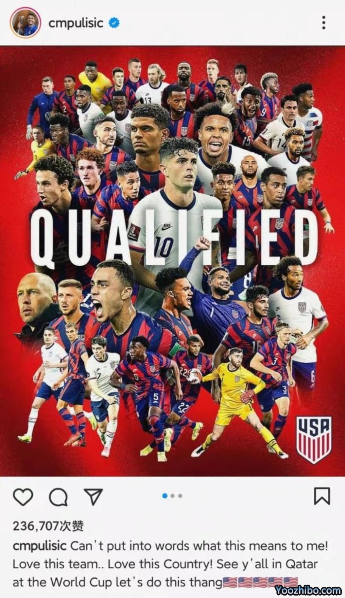 赛后,普利西奇在社交媒体发文:“无法用语言表达这对我的意义!爱这个团队,爱这个国家!卡塔尔世界杯见,让我们一起来做这件事!”