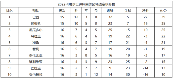 世预赛各大洲即将迎来最后的争夺,欧洲区开启了附加赛决战模式,亚洲区12强赛迎来最后两轮,南美区10强赛也是剩下两轮。南美区的争夺是最惨烈的,他们没有欧洲那么多晋级名额,只有4-1的名额,但是南美区强队如林,巴西、阿根廷、乌拉圭、秘鲁、智利、哥伦比亚都在近些年踢出世界强队的状态,世界排名也是非常靠前的。