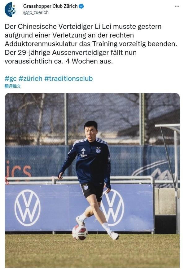 瑞士超级联赛球队草蜢队官方宣布,中国国脚李磊因为在训练中右腿内收肌受伤,预计伤缺四周。这也意味着李磊将退出中国男足12强赛最后2场比赛的名单,提前结束12强赛的征程。