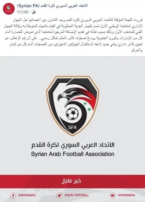叙利亚足球联合会临时委员会经协商,决定解散国家队行政机构,因为工作中没有表现出应有的严肃性,同时解雇球队的技术人员。由于未能为团队提供所需的帮助,我们在对阵阿联酋和韩国的比赛中都输了。后续将宣布新的行政和技术干部,以完成对黎巴嫩和伊拉克的最后两轮预选赛。