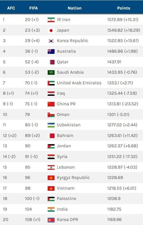 外媒FootyRankings计算了新一期的亚洲各国家队世界排名,中国男足在新一期国家队排名中将下滑一位至世界第75,亚洲层面排第9。