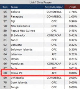 JRS直播网讯 据国外数据网站WeGlobalFootball统计,中国队晋级世界杯决赛圈的概率现在为0.00%。