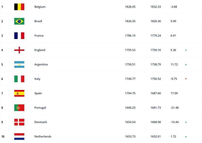 JRS直播网11月20日讯 ,国际足联官方公布了2021年最终国家队排名,比利时继续排名第1,国足位列第74。