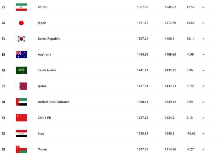 亚洲方面,伊朗、日本、韩国位列前三,中国队排名亚洲第8。