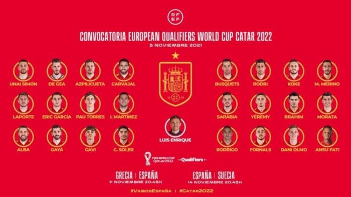 JRS直播网11月06日讯 为征战世预赛,今日,西班牙公布新一期大名单:卡瓦哈尔回归,加维、皮诺、迪亚斯入选。