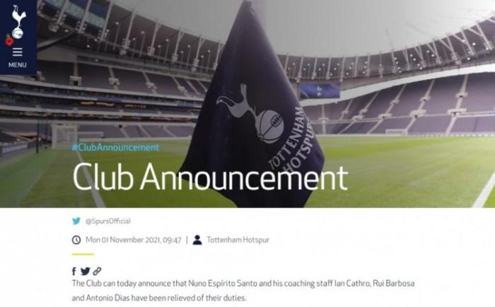 我们在此确认,努诺-桑托和他的教练组伊恩-凯瑟罗、鲁伊-巴博萨和安东尼奥-迪亚已经正式离开球队,不再负责热刺执教事宜。