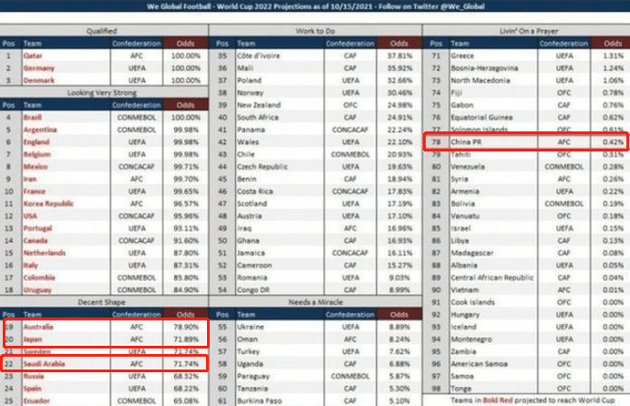 在这样的竞争格局下,我们国足基本是没希望,国足的出线概率只有约0%,预测的具体出线数值只有0.42%,这样的出线概率排在世界倒数第21,亚洲倒数第3,也就是说国足100%出局,与倒数第一、二名的叙利亚、越南没有什么区别。