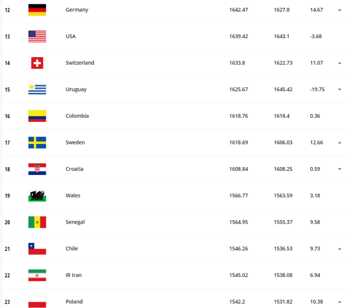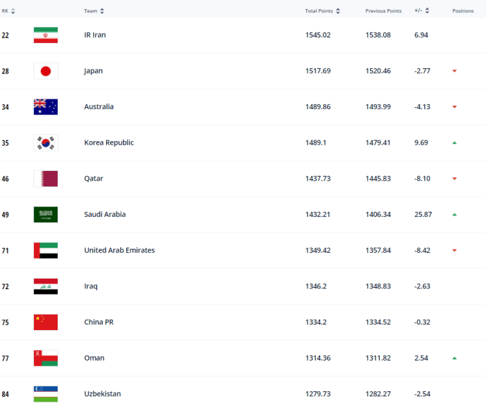 而球迷最关注的亚洲球队排名方面,伊朗队排名亚洲第一,世界排名是第22;随后是日本队,他们世界排名第28,跟着是澳大利亚队,他们世界排名是34,第四是韩国队,他们世界排名第35,第五是卡塔尔队,世界排名第46,第六是沙特,世界排名第49名;第七是阿联酋,世界排名第71,第八是伊拉克,世界排名72,第九是国足,世界排名第75,第十是阿曼,世界排名第77。