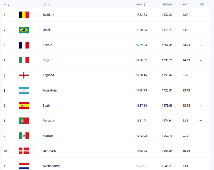 如图,比利时虽然在欧国联比赛中接连输给法国和意大利,但是他们依然排名榜首,而且他们拥有很大的积分优势,短期内是不会下滑的,而排名第二的依然是巴西队。法国队在本次欧国联的比赛中接连获胜,他们的排名上升到第三,而意大利上升到了第四。其他球队第五到第十分别是英格兰、阿根廷、西班牙、葡萄牙、墨西哥和丹麦。11到底20分别是荷兰、德国、美国、瑞士、乌拉圭、哥伦比亚、瑞典、克罗地亚、威尔士和塞内加尔。