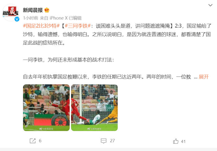 沪媒也是三问李铁,其一世预赛已经打了四轮为何现在仍没形成基本战术打法?凌乱的进攻、苍白的中场控制力、略显脆弱的防线,只是随着对手变化而盲目调整阵容!其二为何不敢用归化?当初花费了很大的财力去归化他们,为什么现在不能大胆启用他们?其三热身赛能解决体能问题吗?