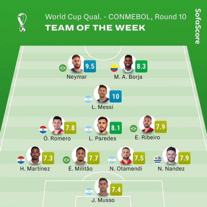 JRS直播网9月11日讯 随着本周世预赛南美区比赛的结束,足球数据评分网站SofaScore评选了本周南美世预赛的最佳阵容。其中,梅西以满分10分领衔。