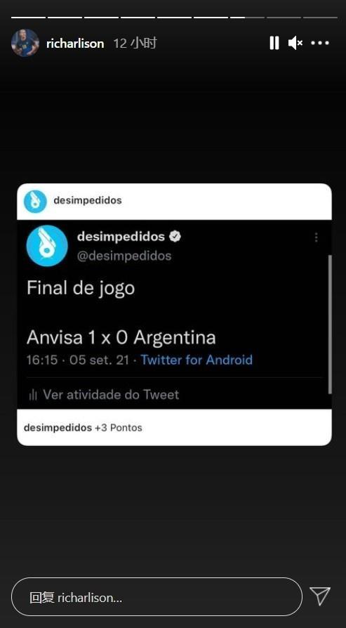 JRS直播网9月07日讯消息,巴西阿根廷的比赛中断后,巴西球星理查利森转发推特“巴西卫生局1-0阿根廷”。